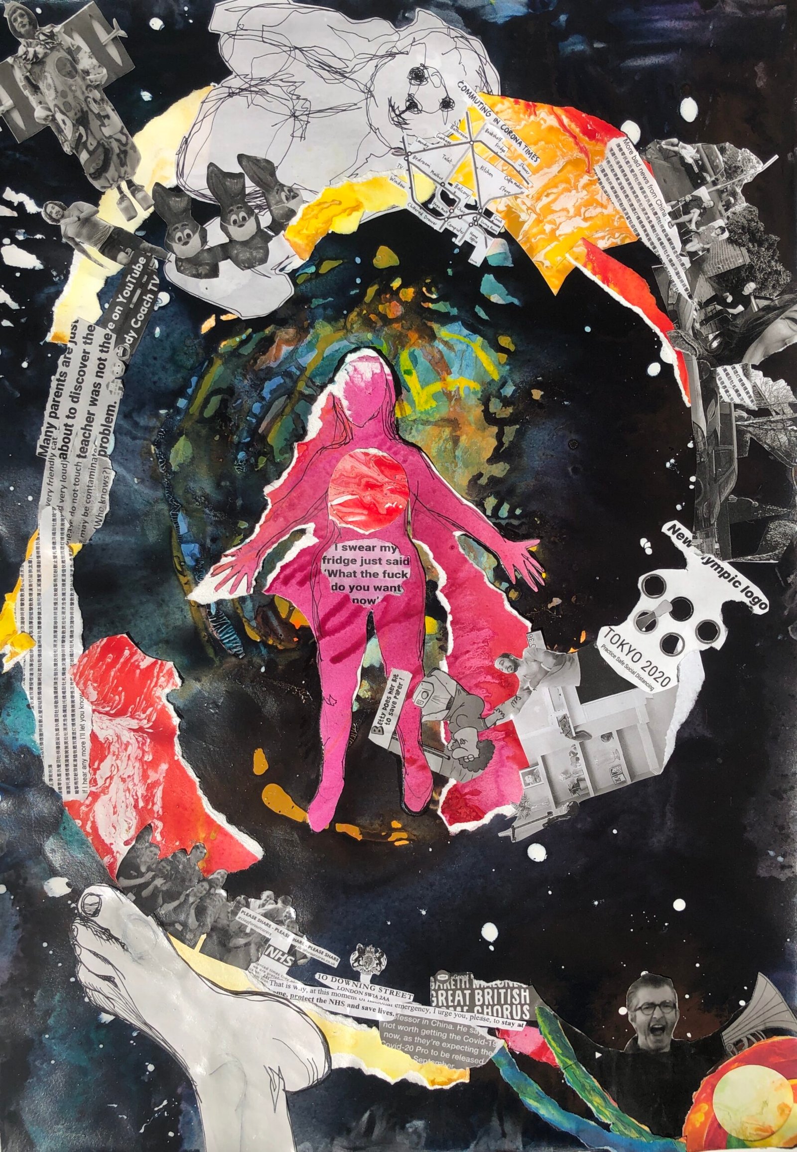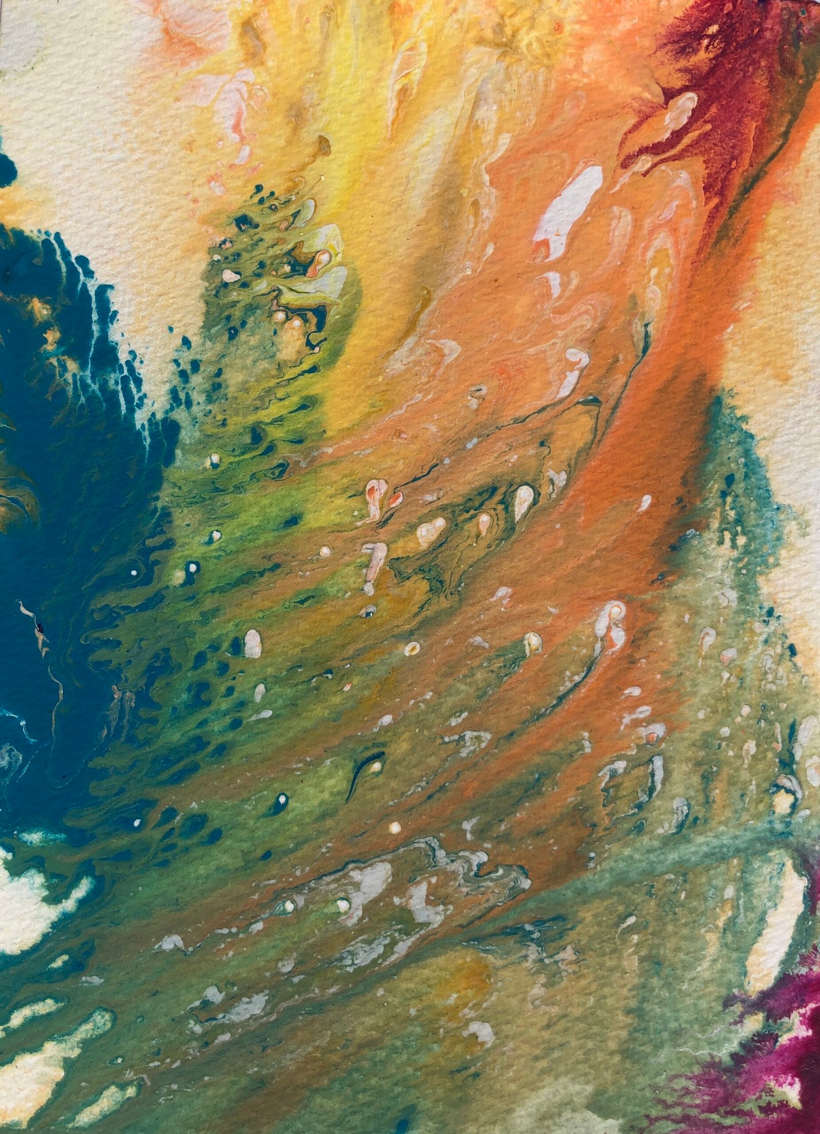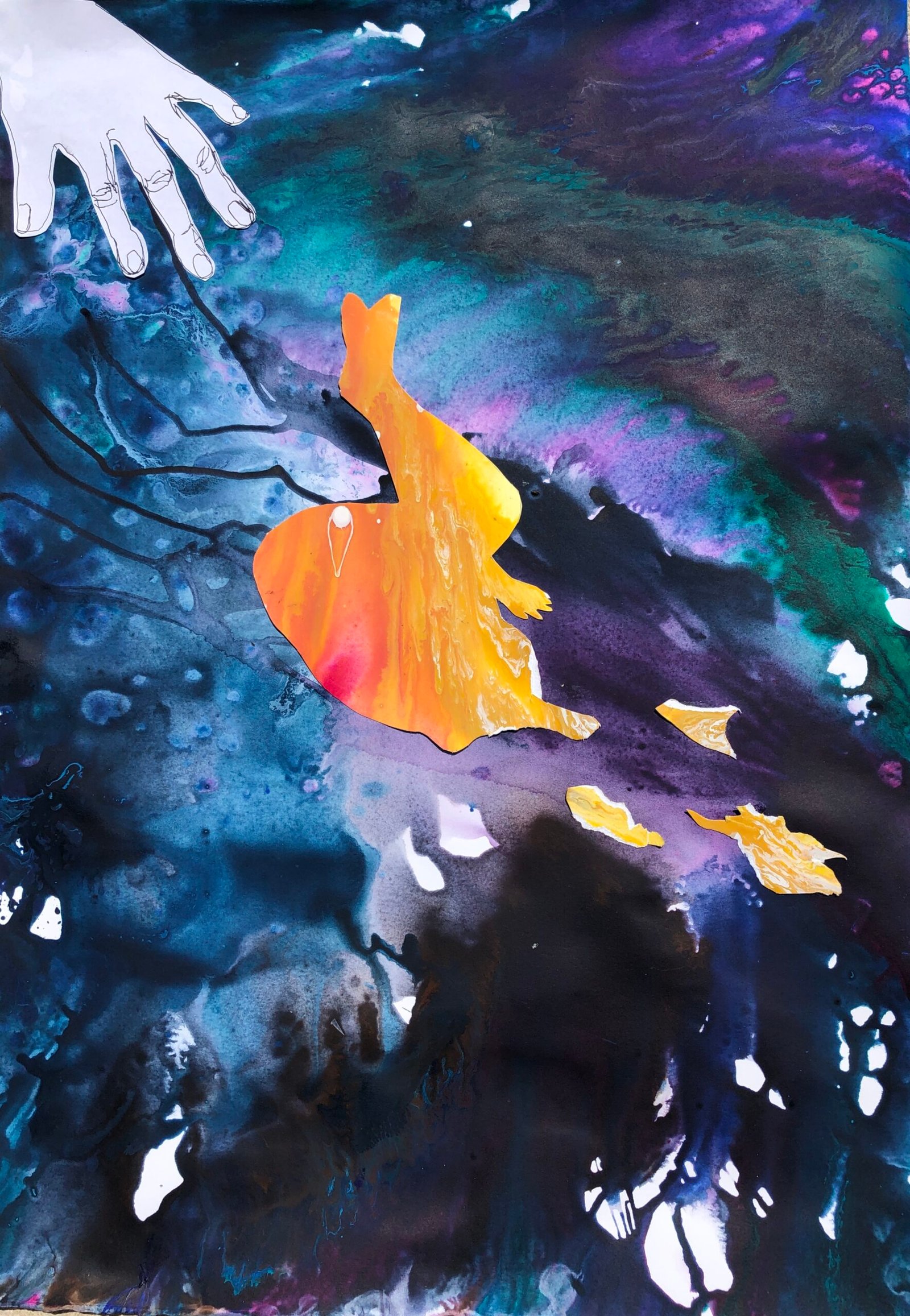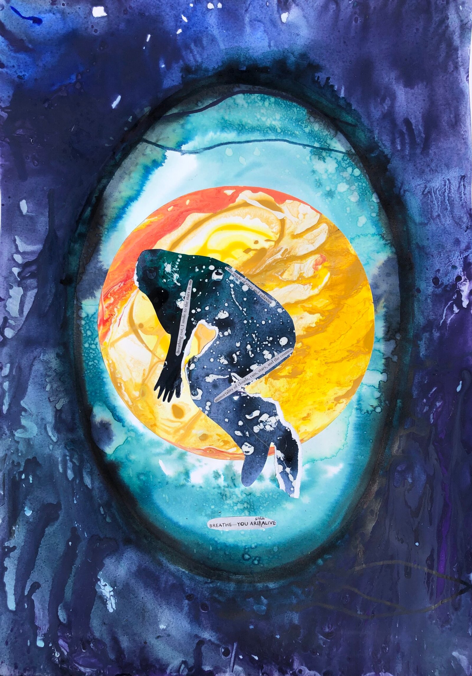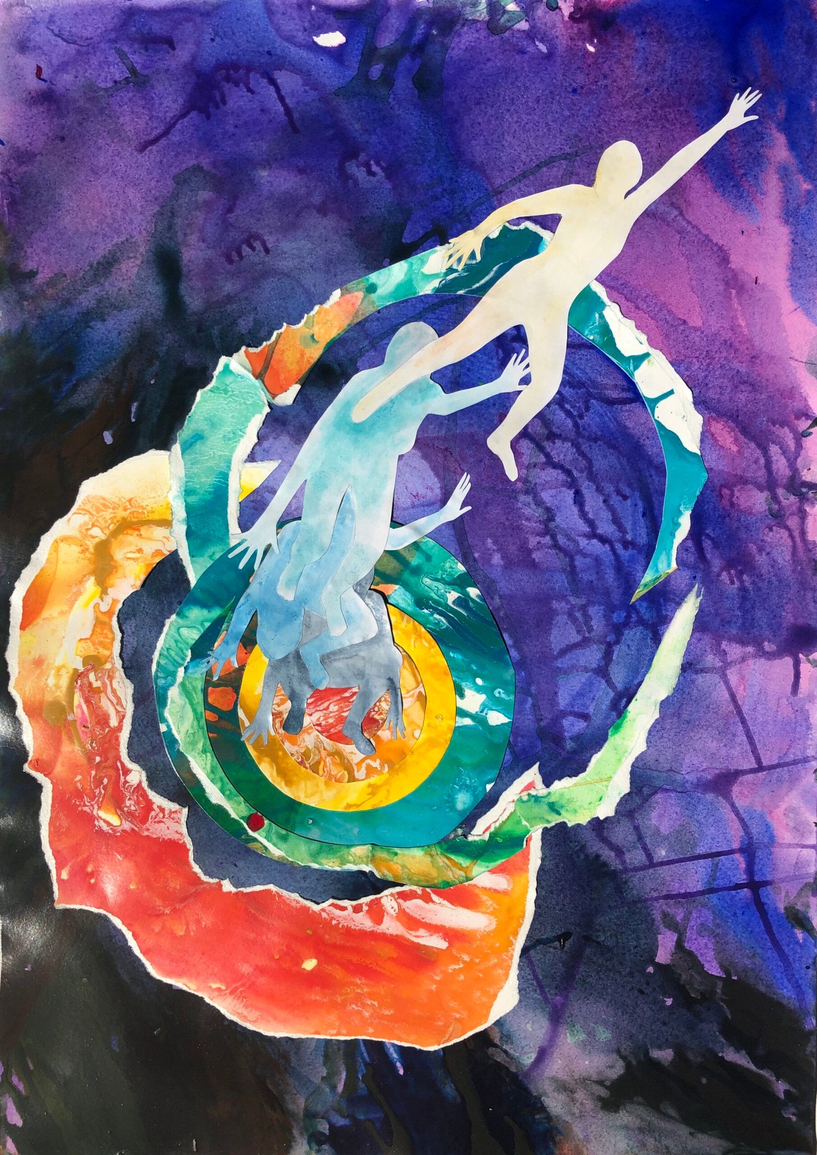 Hurtling through space, severed from the life space as I knew it. Snatched from the containment of safe known care with no reference points to cling to. Catapulted into a liminal space between life and death, oceans of cosmos enveloping me, streaming colour illuminating me. My familiar puzzle is shattered and the pieces do not fit together as before. I saturate myself and my paper in water and flowing colour, asking to be shown new meaning, new connection and how to find my way home. Torn from my mooring point, I tear the paper, I forget to breathe….