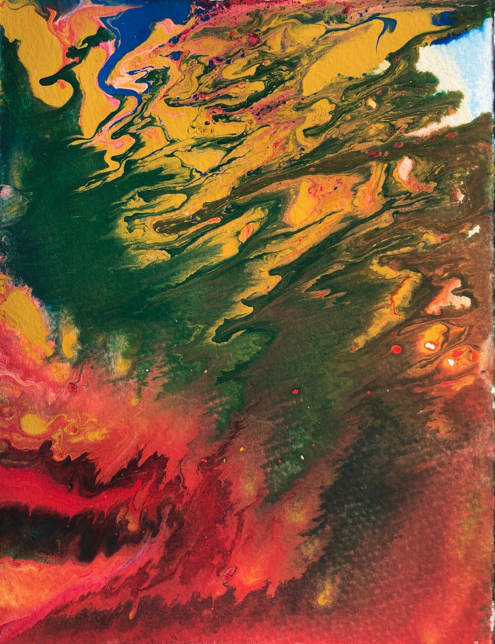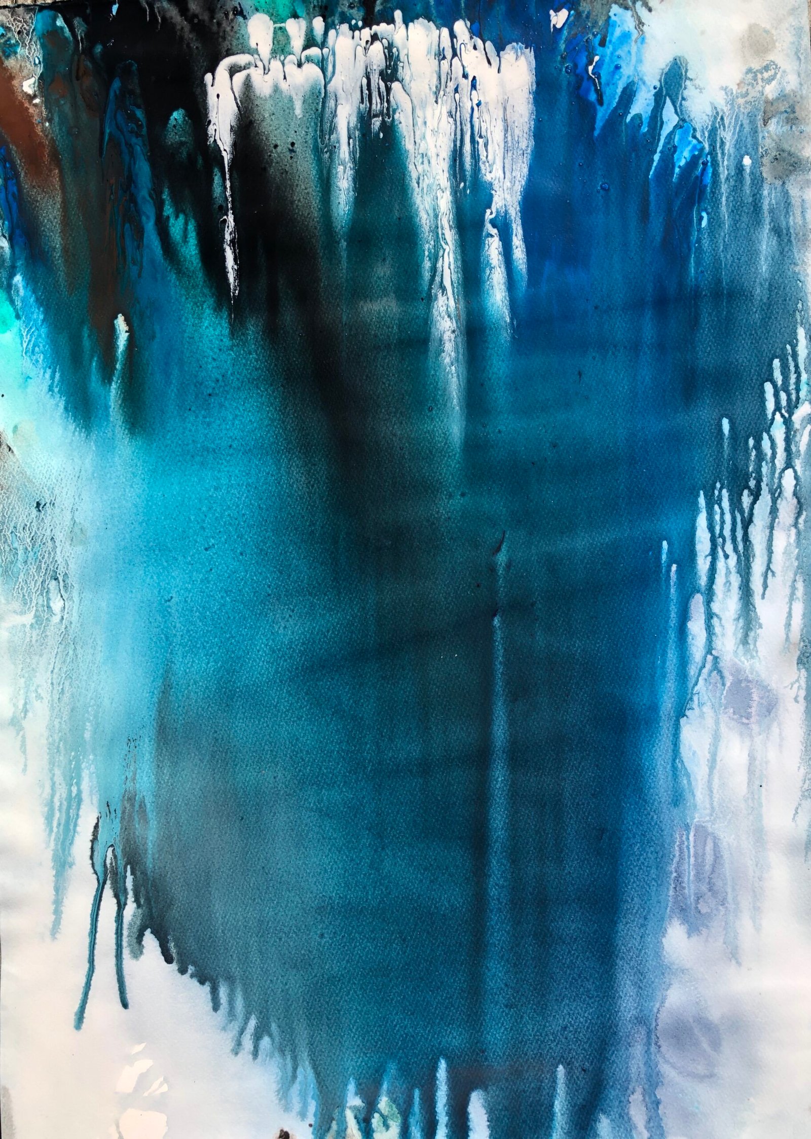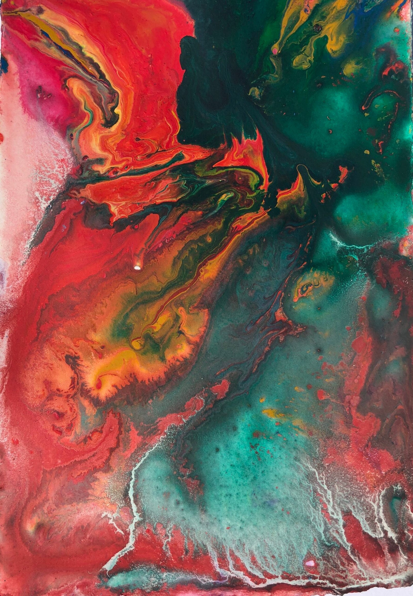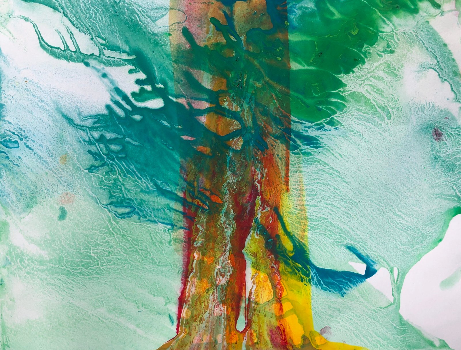 Engulfed in flow, I wash colours through the paper as they wash through me. Am I birthing, being or dying? Unclear, I allow the flow, front is back, back is front, I undulate in the waves of time, part of an evolutionary process I don’t understand. I want to reach out but don’t know how… Feeling the illness of our planet, calling us to care…