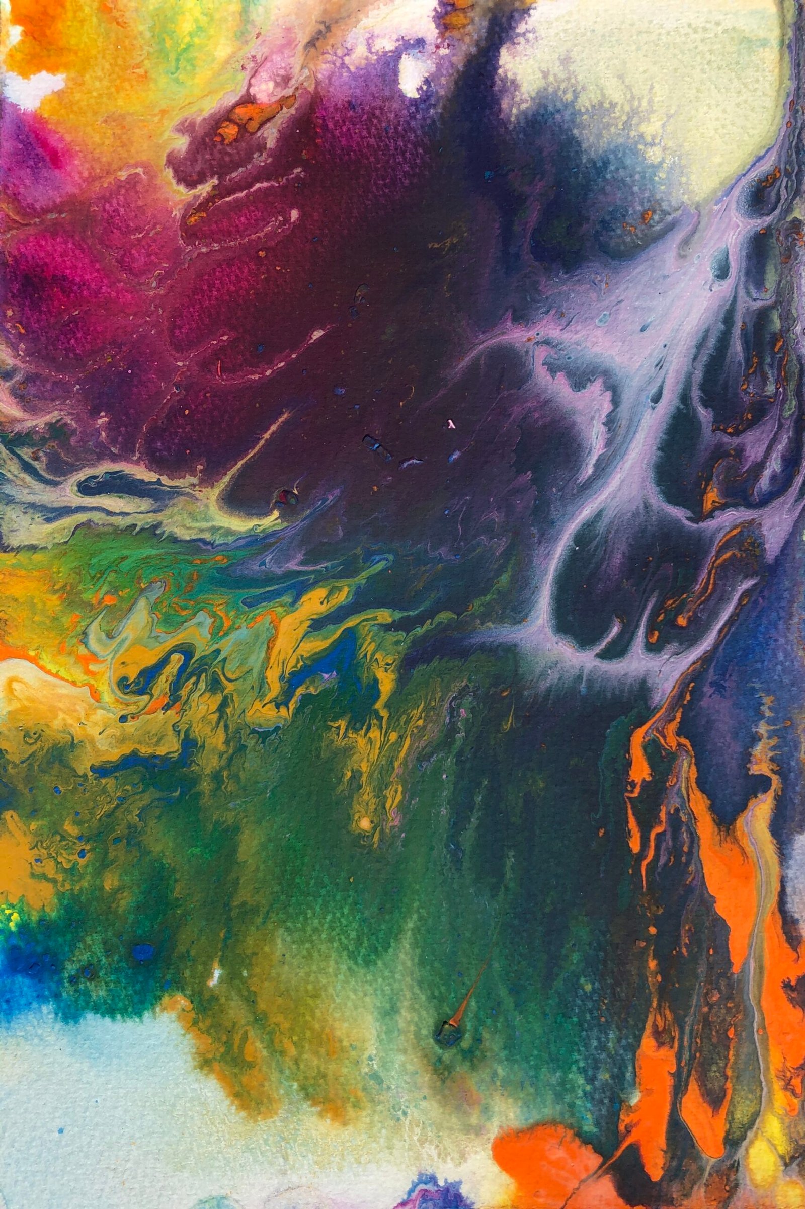These paintings were produced as part of a contemplative practice during the restrictions of lockdown, using fluid acrylics to connect progressively to a sense of calm. The process involved submerging watercolour paper in water, mixing up a range of colours in acrylic and then pouring these at different speeds onto the paper to enable a fluid way forwards towards calm from constraint to emerge and guide. Each painting developed and layered on the previous ones whilst a new pathway emerged.