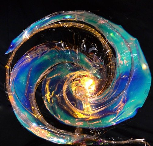 A luminous vortex of light and movement, captured from an iridescent sculptural installation with fibreoptics and photographed in motion. Shifting tones of gold and deep blue create a sense of unfolding energy and quiet transformation.